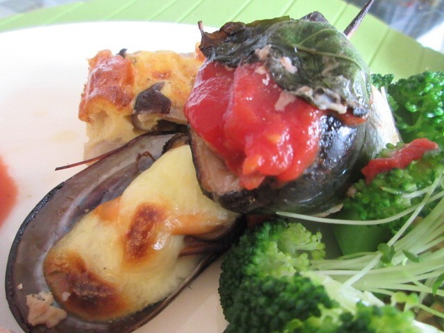 岩手産のムール貝のチーズ焼き、気仙沼産のさんまにバジルとトマト