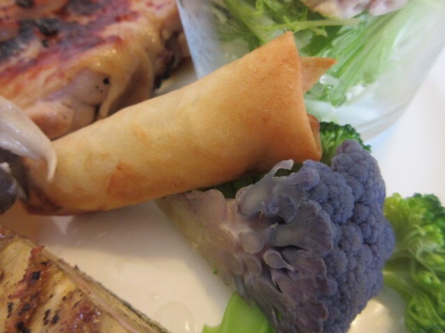 キッシュのようなお料理は、岩出山のケール、ハム、さつまいもが層になっています。春巻きには、富山のほたるいかと岩出山の赤ねぎが詰まっています。赤ねぎを見せていただきましたが、茎の下半分くらいがきれいな赤色なんですね。