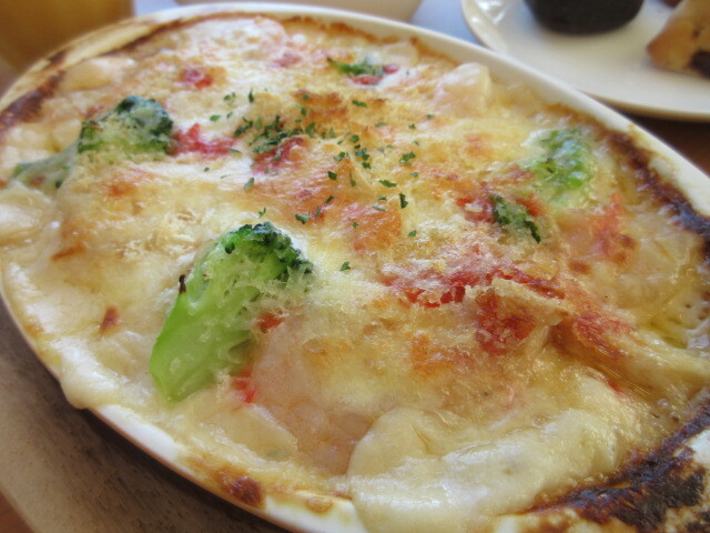 海老と野菜のクリームドリア1,200円+ランチセット200円。クリームに埋まっていて見えませんが、大きめでプリップリの海老がいっぱい入っていました。濃厚でミルキーなクリームの下には、トマト味のライスが入っています。熱々でおいしい!
