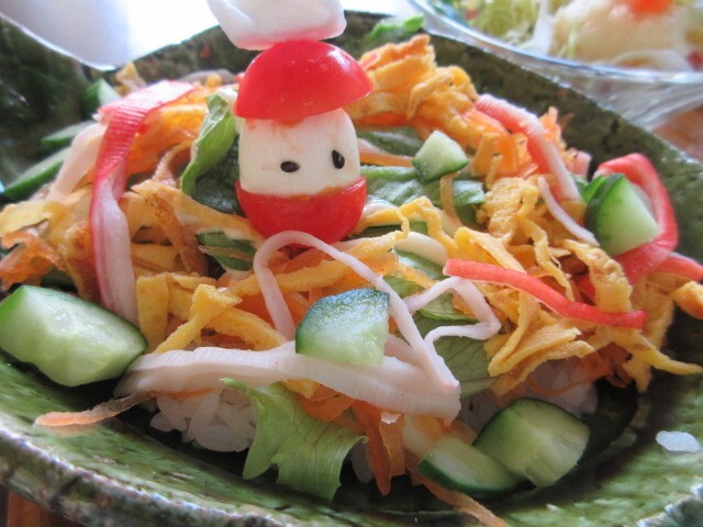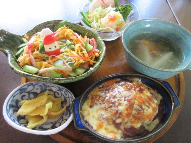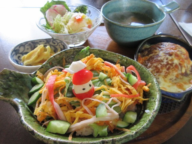 デミハンバーグと洋風ちらしのセット(ドリンク、デザート付き)1,000円。華やかで盛りだくさんのランチです!ハンバーグに、コクのあるデミグラスソースとチーズをのせてあります。ハンバーグは厚みがあり、ふっくらしていました。洋風ちらしは、しいたけやれんこんと酢飯を混ぜ込んだご飯に、かにかま、きゅうり、錦糸卵、レタスなどがたっぷり。上にのっているのは、トマトとチーズで作られたサンタさんです。カワイイ☆ ポテサラにはお星さま。かぶ、にんじんなどの根菜が入ったあっさり味。店主さん手作りのたくあんもおいしかったです。