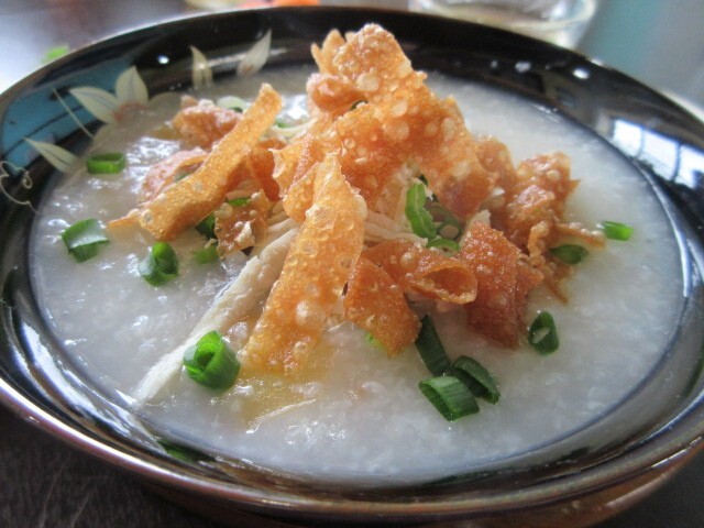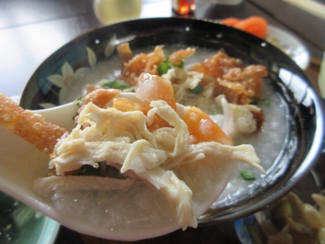 中華粥には、鶏肉、揚げたワンタン皮、青ネギがいっぱい。