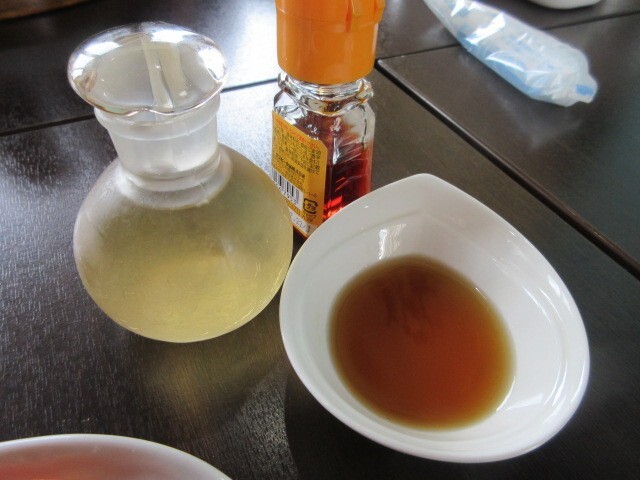 中華粥に、お好みで酢、黒酢、ラー油を入れます