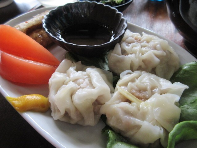 シューマイはお肉みっちり、ジューシーでこちらもおいしかった~。ごぼう天や野菜サラダ添えです。ザーサイ、ほうれんそうのごま和え、柚子大根、わかめスープもおいしいかった~!