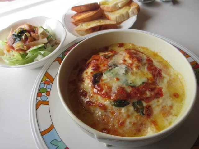 リゾットのトマトグラタン1,000円。こんがり焼けたとろけるチーズの下には、トマト味のリゾットがいっぱい。バジルが入って風味が良い。量も多くてボリューム満点でした。