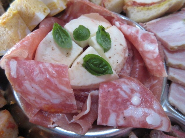 カプレーゼは、モッツァレラチーズ、トマト、生ハムが層のように重なっていて、バジルの葉がのり、さらにサラミと生ハムがあしらわれて、手が込んでいました。