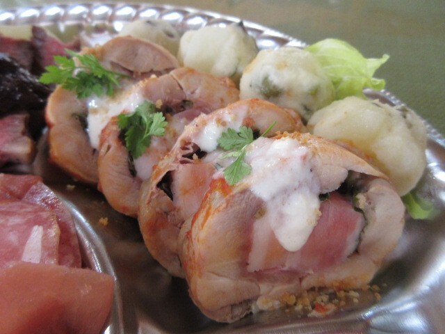 自家製パンチェッタの鶏肉巻き。パンチェッタ(イタリアのハム)は自家製。鶏肉で巻いてあり、ふんわりとハーブの風味でおいしかった~。