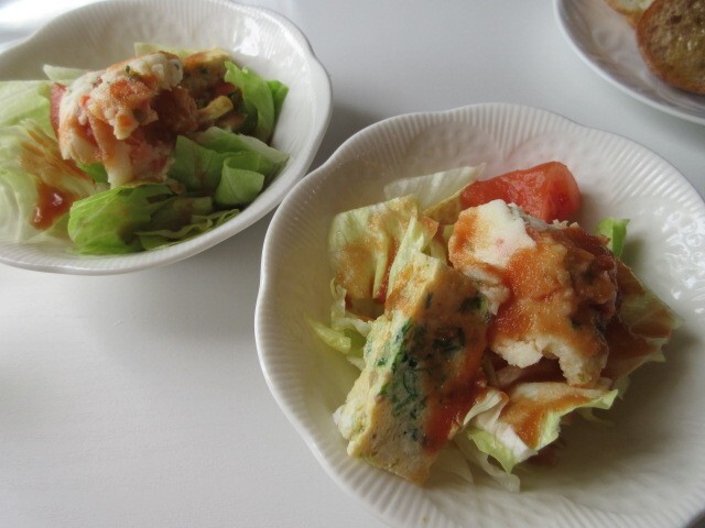 ランチにはサラダとパンが付きます。今回のサラダは、オムレツとポテトサラダがのっていて食べ応えがありました。パンは2種類で、オリーブオイルをかけてあるのがいいですね。