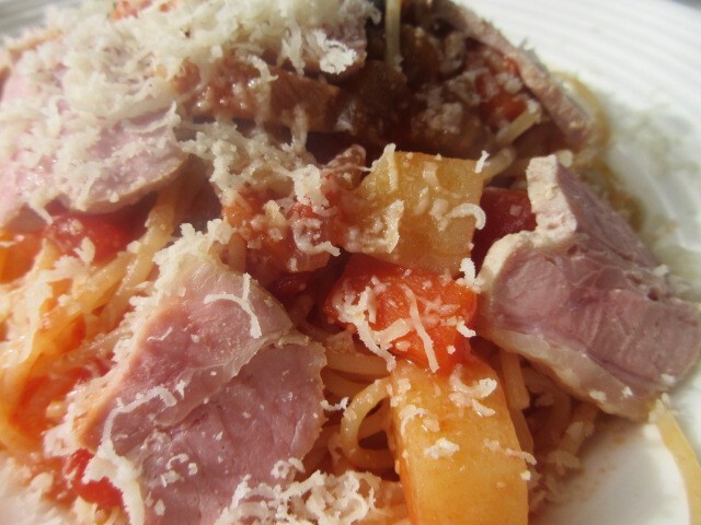 自家製ベーコンのトマトスパゲッティ1,000円。厚みのある自家製ベーコンはしっとりしてお肉の旨みが濃い。じゃがいも、にんじん、パプリカなどの野菜が入ったトマトソースにすりおろしたチーズがおいしい!しかも量も多い!