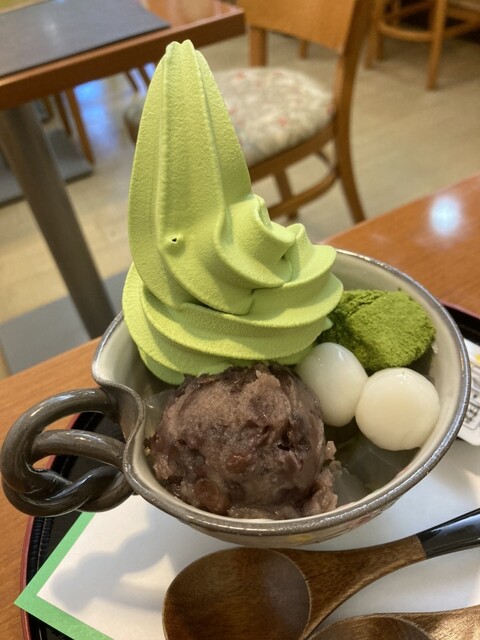 寒い時でも美味しい『あんみつ』、濃厚な抹茶ソフトに、何で?と思うかも知れませんが、これ又濃い抹茶蜜をかけて食べるソフトは絶品です!笑