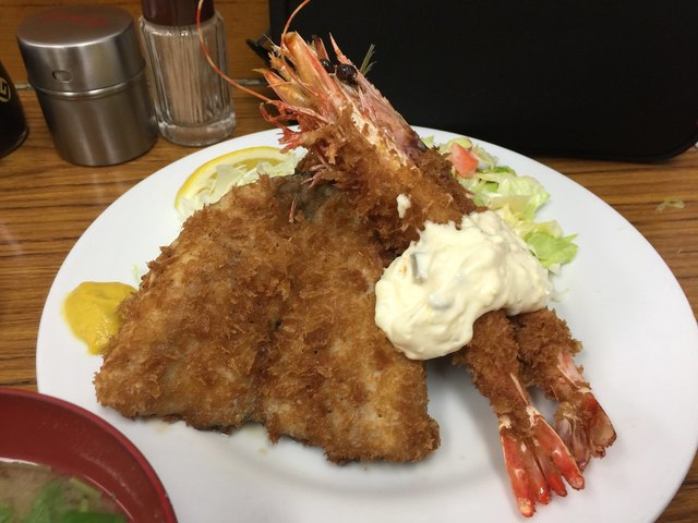 ぷりぷりの車海老と、フワッフワッのアジフライ。八千代さんのアジフライを食べると、他のアジフライは食べられない。