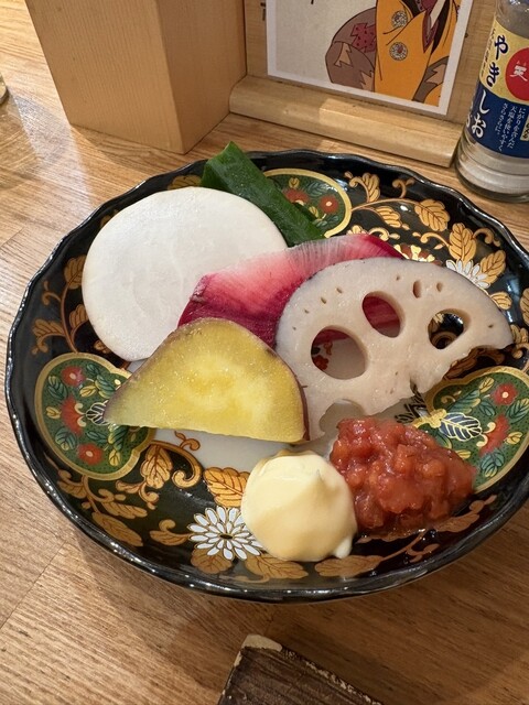 ポテサラは自分で混ぜて完成させるタイプで、明太子といぶりがっこ付き