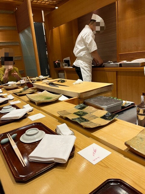 JR新橋駅から徒歩5分ほどのところにある当店。駐車場なし。当店は、1935年に今田壽治氏によって創業され、与志乃、奈加田とともに銀座御三家と称された高級寿司店。雲丹の軍艦巻を考案されたことでも知られていて、この雲丹の軍艦巻は是非食べたいところ。今日に至るまで北大路魯山人やオバマ大統領などにも利用された。また、のれん分けにより多くの寿司職人を輩出したことでも知られるお寿司の名店中の名店。今回の東京旅行の1番の目的。1か月前に予約して、土曜日の11時30分のオープン時間に予約。予約はこの11時30分のみで、後は並びになる。当日、11時10分にお店に到着。ビルに挟まれるようにある外観だが、店内は高級感漂う。本店4階の魯山人ミニギャラリーに案内してもらった。ここでオープン時間まで待機するのだが、このギャラリーも是非見たいと思っていたから、ちょうど良かった。じっくりとギャラリーを見学し終わった頃にお出迎えがあり、本館から数十メートル離れている別館の掘り炬燵式カウンター席に案内してもらった。接客は丁寧で、一見さんの我々にも丁寧に対応していただいた。お願いしたのは、