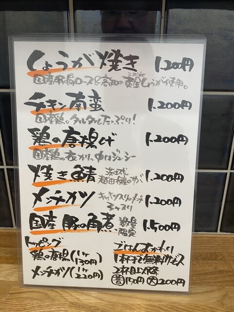 11:45入店。外に2たり待ち。席はカウンター5席と2人掛けテーブル2脚、9人で満席。あまり待たずに座れた。メンチカツ定食1,200円。メンチは3個。ジュウシーで美味しい。洋がらしをリクエスト。キャベツ、タマネギサラダ、大根とこんにゃくの煮物、お新香、ライス、揚げと豆腐の味噌汁。夫婦で経営。定食に他のメニューを追加する人が多かった。住宅街の中の美味しいお店。