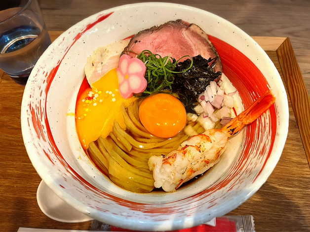 トッピングもミニ男気チャーシューにローストビーフに生と茹での2種の海老など楽しさいっぱいな一杯でした‼️