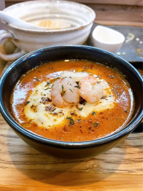 今日はえびそば緋彩@名古屋市瑞穂区明前町で、海老とトマトの特製濃厚つけそば&チーズリゾット。