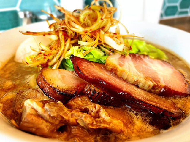 でっかいほろほろチャーシューもたまらんですけど、追加で頼んだ吊し焼き焼豚も安定の美味さ‼️端っこ肉も乗ってて、マジ感謝(^人^)