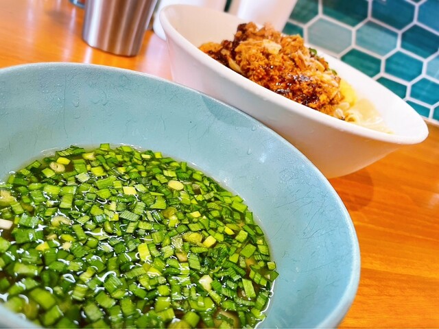 まずは麺をそのまま、台湾ミンチと混ぜて、つけ汁であっさりと、超平打ち麺も添えられてて、楽しみ方がいっぱい
