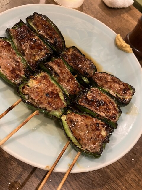 レバーに、つくねはタレと塩両方、混合にシロ、ピーマンの肉づめ。