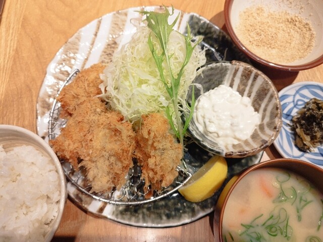 カキフライ(1個350円)4個、タルタル多め、にご飯セット(500円)。自分でカキフライ定食を作って食べてます笑