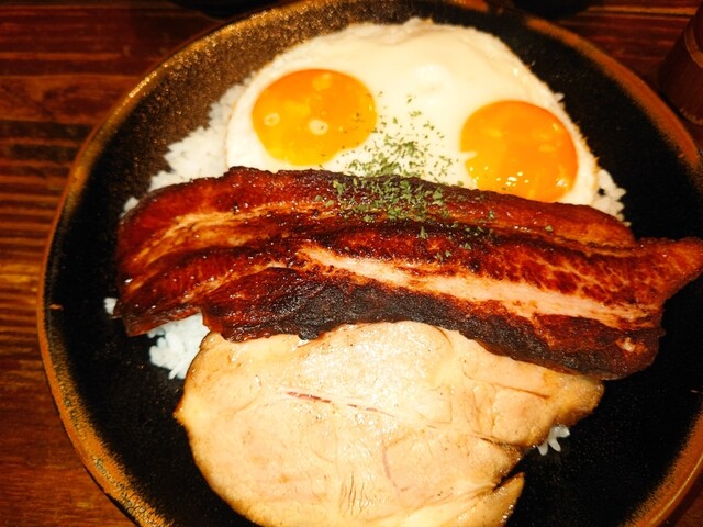 厚く大きいベーコンとローストポーク、そして目玉焼き2つがお皿いっぱいに盛り付けられており、まったくライスが見えない。