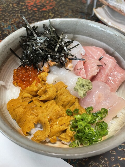 【感想等】旅行のため財布の紐は緩い、後悔しないよう欲望のまま注文。ネタも高級だが味も抜群の海鮮丼、萩に来たら絶対に食べるべき!イカもフグも絶品だが、この海鮮丼は最高に満足度が高い、しかもお昼限定!2021年6月バナナマンせっかくグルメでも放映。