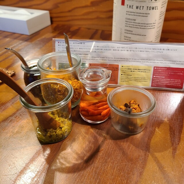 他の調味料も活用しながらどんどん食べ進めていきます。というかプレートだけでこんなに具沢山なのに、さらに味変アイテムが4種もあるなんてすごい。なんならカレーかけずライス+調味料だけでもいける。そしてそちらの方が調味料による味の変化が分かりやすい。
