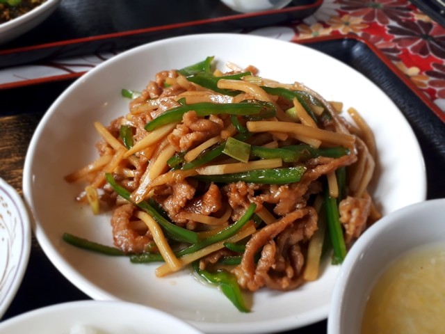 野菜炒めといいつつも豚肉の細切りと玉子たっぷりでベタな野菜炒めと違う。