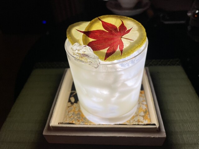 湯河原離宮のロビーラウンジで、ちょっとお高いカクテル2420円(税サービス料込み)をいただきました。