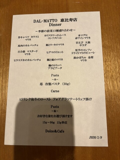 前回美味しくて夜にしてはコスパも良く、お友達の集まりでこちらに再訪させて頂きました。多少の中は違うものの前菜盛り合わせからの冷製パスタ、お肉料理、温かいパスタ、デザートの流れは同じです。盛り合わせ前菜の時は余裕だったのですが、お肉食べてる頃にはもうお腹ぱんぱんタイマーが鳴って、30gのパスタも入らない感じでした。
