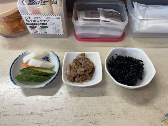 今日の副菜は漬物、あじの卵の煮物、ひじき。