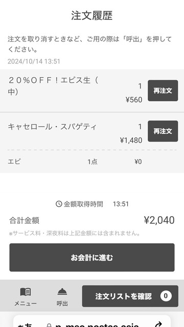 キャセロール・スパゲティ1480円+20%OFF!エビス生(中)560円=2040円
