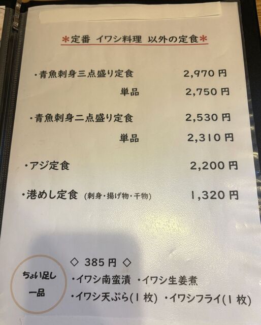 この日目指すのは「いわし料理」の「磯はる食堂」さん。これまでも何度か店前までやってきましたが、刺身用のイワシの入荷が無いようだったのであきらめていました。恐る恐る店頭のボードを見ると「久しぶりに刺身用イワシ入荷‼」と書かれています。嬉々として入店しました。