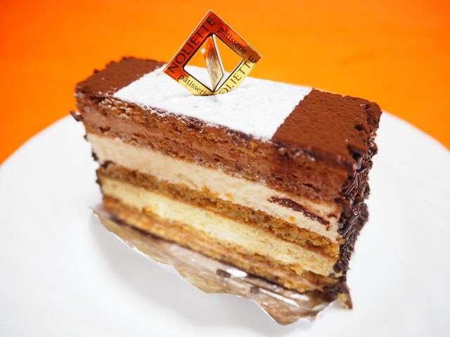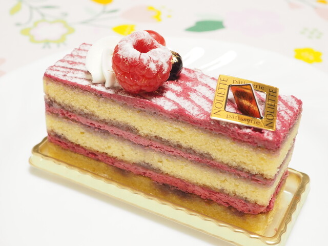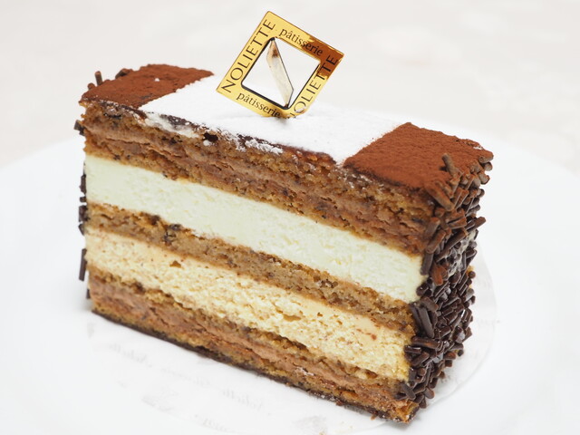 オペラにピスタチオムースを入れたケーキで、食感はしっかりしたジョコンド生地が占めてている。