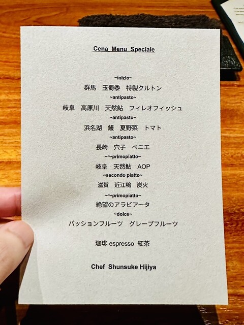 シェフの父が岐阜・高原川で釣り上げる天然鮎を使った夏限定コースが最高過ぎる。特に鮎のアーリオ・オーリオは丸ごと炭火焼きした香ばしさと内臓のほろ苦さが抜群で人生No.1パスタ。ライブ感あるカウンターにこの内容この価格は◎。