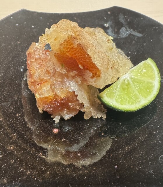 フカヒレの揚げ物は、香ばしくももっちりとした口当たり。寿司屋でこの一品が出るのは驚きと嬉しさの両方をくれる。