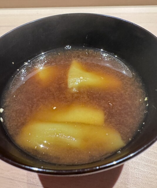 焼き茄子の赤出汁でほっと一息。香ばしい香りが鼻を抜け、口の中をさっぱり整えてくれる。