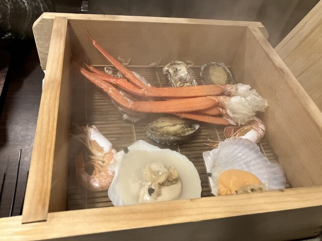 卓上のせいろで蒸し焼きにする魚介類(ずわいカニ、はまぐり、帆立、あさり、サザエ、海老)が圧巻!もうこれだけでテンション上がりました。