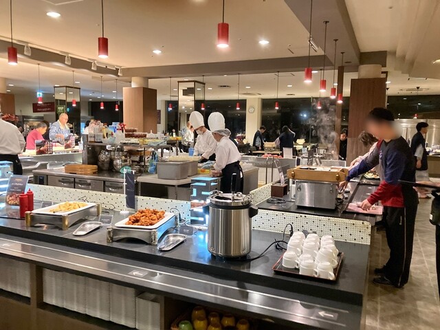 夕食ビュッフェは混雑緩和のため、18時と19時半スタートの2部制、食事会場はかなり広い。19時半に入り空いているテーブルに着席。ビュッフェは最初混んでて、空き出したのは20時頃。ストレスなく食べるなら少し遅めを狙うのが良さげです。