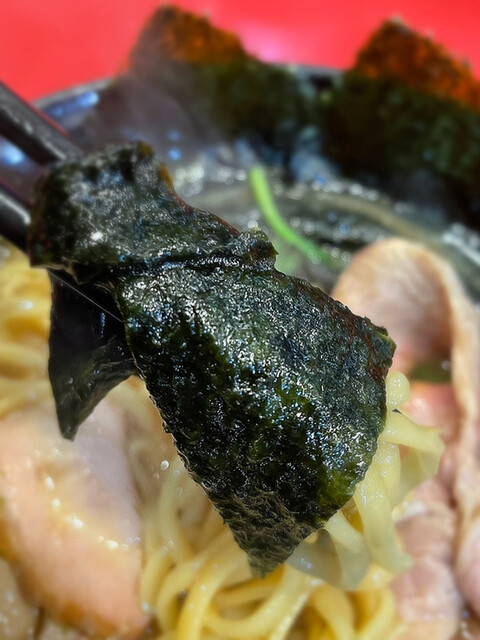 濃紫の板海苔は若干薄くなったのでしょうか、スープに浸して麺を包み込む際、崩れ気味になるのが気になりますよ。