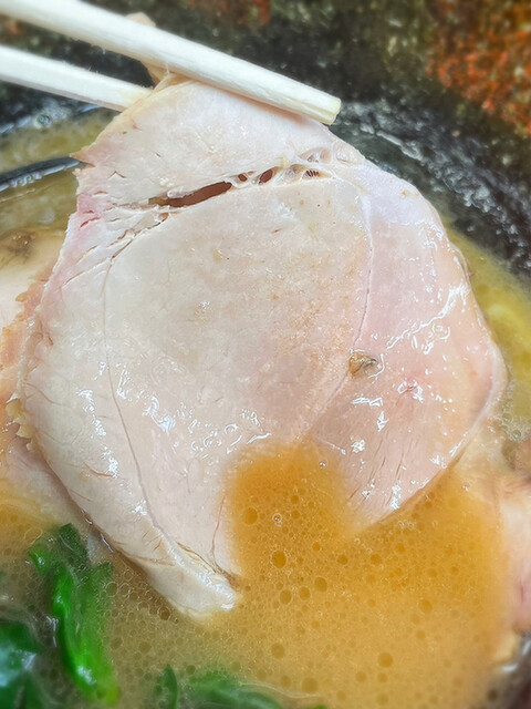 約5分程で着丼、家系を正しく踏襲する外観は、透き通り粘度を感じる多目な鶏油が目を引きます。