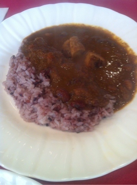 そんな旦那は薬膳チキンカレー。硬めの五穀米が粘り気のあるカレーとピッタリ。
