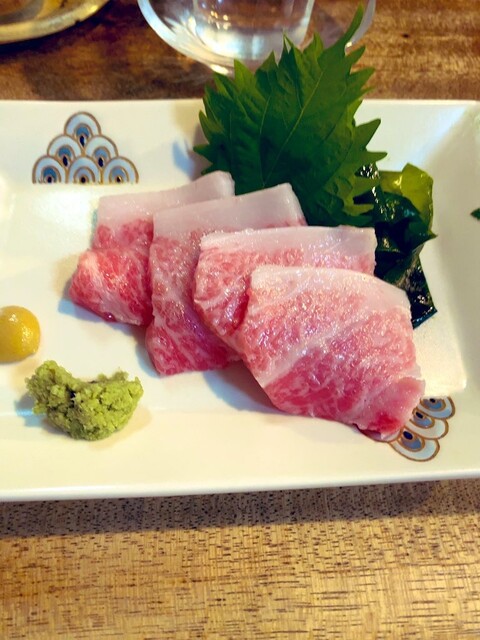 ユッケで頼んだクジラの鹿の子がめちゃくちゃ美味い!上質な生の牛カルビをより甘くしてほどよい食感を得た感じかな