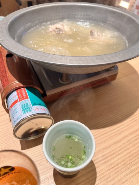 水炊きが有名なんだよと会話してると連れのご夫婦から水炊きも食べよ〜と。鍋の中、ボイルした鶏とスープだけでセット。連れの奥さん、これだけ??とナイスなボケ笑