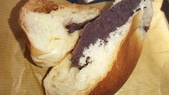 中を開けてみるときめ細やかなこし餡がたっぷり入っています。餡は和菓子の生菓子にも使えそうな綺麗なこし餡です。ふわふわの焼きたてのパンとこし餡は絶妙な味わいで、これぞあんぱん!って感じです。