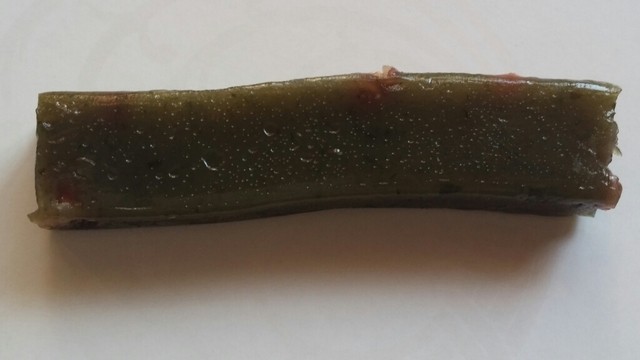 蓬は国内天然のものを使用されており、中から蓬の香りがします。食べるとふにふにしたわらび粉に蓬が練り込んであり蓬の風味が口一杯に広がります。大納言小豆が所々練り込んでありとっても上品な美味しい和菓子でした。