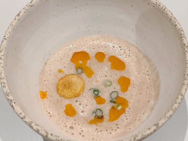 竹炭で色を付けた九条ネギの黒いピューレが斬新。