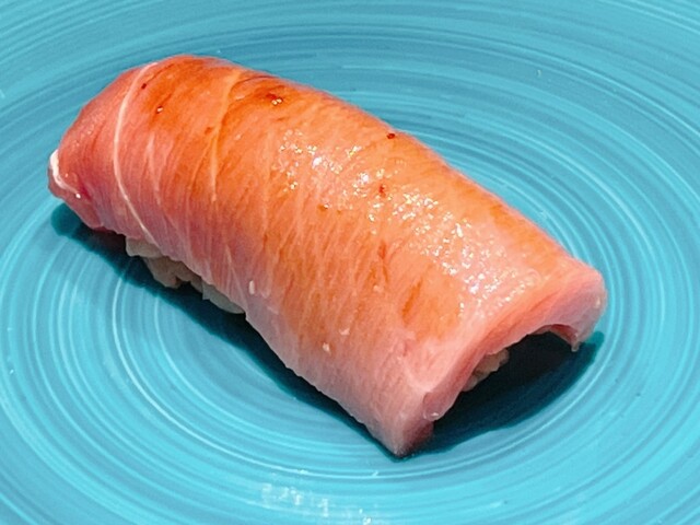 赤身の中でも最上の“天身”の部分を薄く切って折り畳んで握るお寿司。
