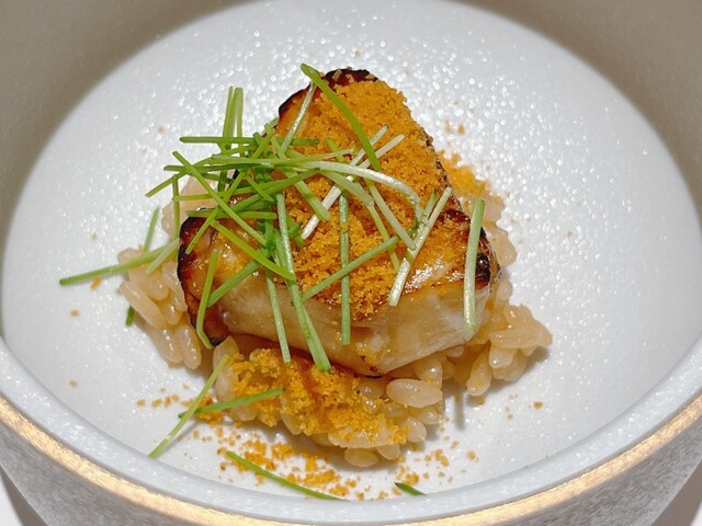 このヒラマサの幽庵焼きに乗っているのは、鰹の酒盗と卵黄と調味料を合わせ、6時間くらい水分を飛ばして作ったオレンジ色のパウダー。