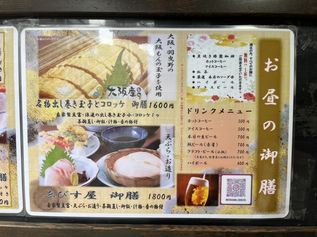 ランチメニューは「大きなコロッケ 御膳」「大きな海老フライ 御膳」「海老フライ1本 名物コロッケ1ヶ 御膳」「名物出し巻き玉子とコロッケ 御膳」「ゑびす屋 御膳」という定番のメニュー。