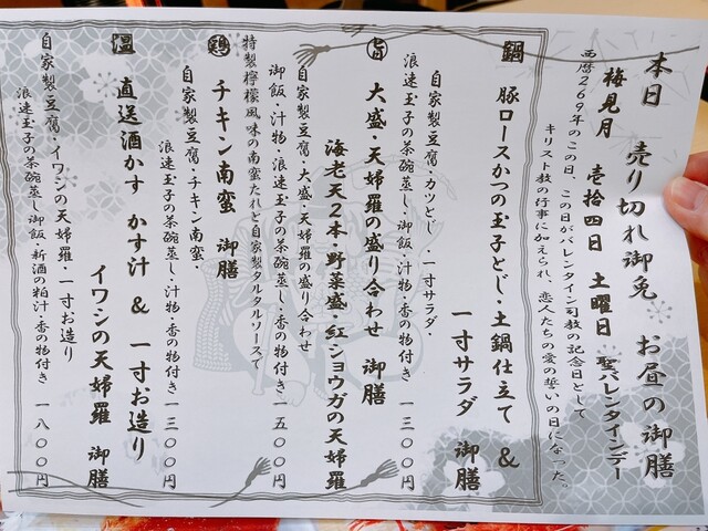 そしてそれに加え、紙に書かれた「本日 売り切れ御免 お昼の御膳」として「豚ロースかつの玉子とじ・土鍋仕立て&ー寸サラダ 御膳」「大盛・天婦羅の盛り合わせ 御膳」「チキン南蛮 御膳」「直送酒かす かす汁&一寸お造り イワシの天婦羅 御膳」という恐ろしく魅力的なメニューも。